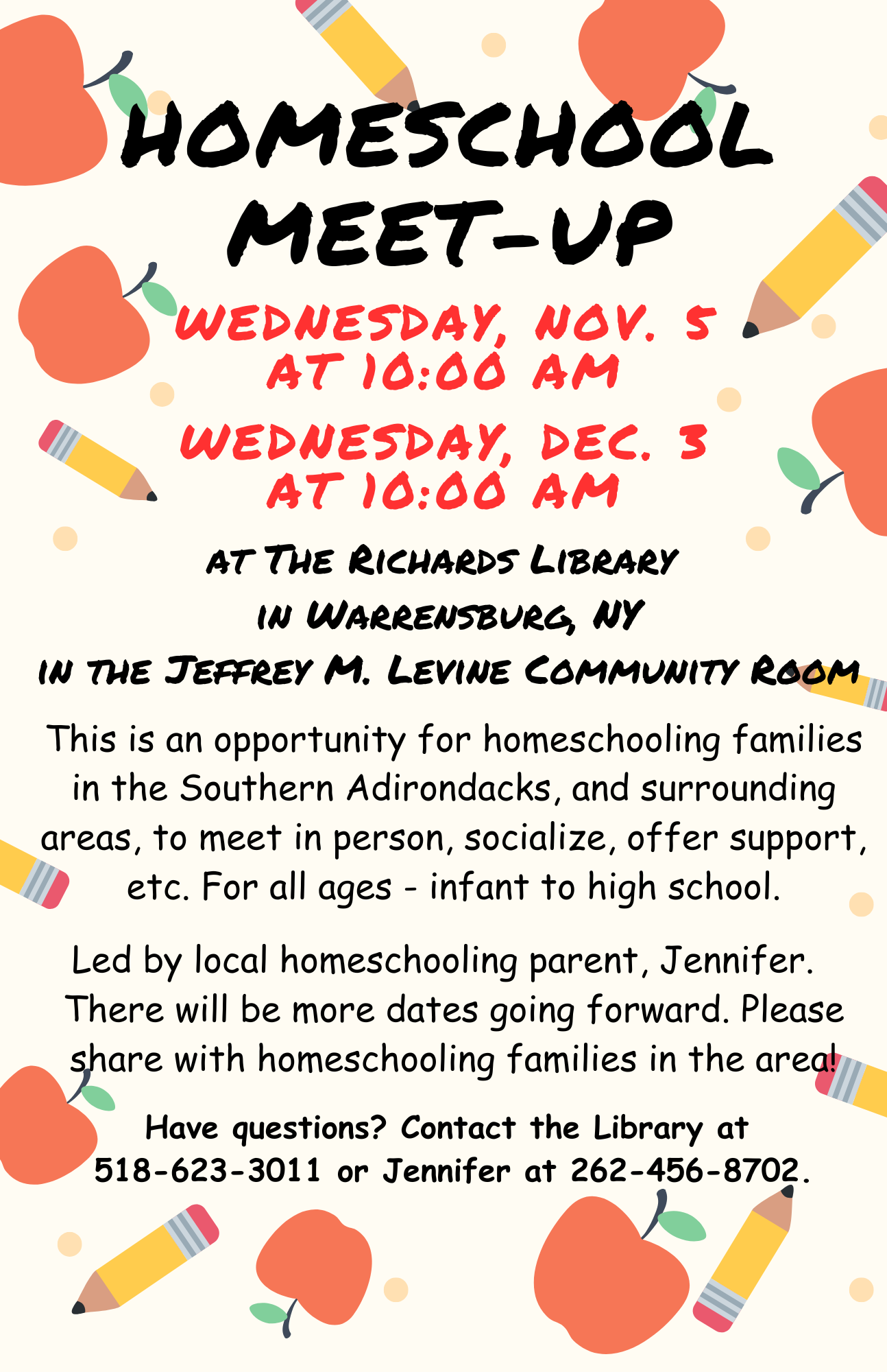 November 3, 2025(6 events) – Join us for a crisp and creative morning celebrating all things apples! We’ll explore the science behind this favorite fall fruit through hands-on experiments, then dive into apple-inspired art projects to spark imagination. Kids can learn, create, and socialize with peers, while caregivers connect, share resources, and work together to build a strong homeschool community. – Hark! Homeschoolers ages 13-19 are invited to stop by the Teen Center to make a wooden medieval meme ornament. Hast thou got an eye for medieval art? Hast thou got a saucy wit? Whether you do or don't, come socialize and make a fine keepsake to adorn your castle. It's super easy and just barely educational. This program is a part of our regular monthly Homeschool Hangout for homeschoolers ages 13-19. – Registration required: Wilton Wildlife Preserve & Park Come enjoy nature with others looking to get outside. This walk is geared towards gentle exercise and those with basic fitness levels. This program is suitable for ages 16 and up. – Registration required: Caldwell-Lake George Library Caldwell-Lake George Library is excited to continue our popular children's yoga storytime program, Once Upon a Time Yoga Adventures! Our "Little Yogis" ages 3-4 years old will meet on the following dates at 2:45 pm: