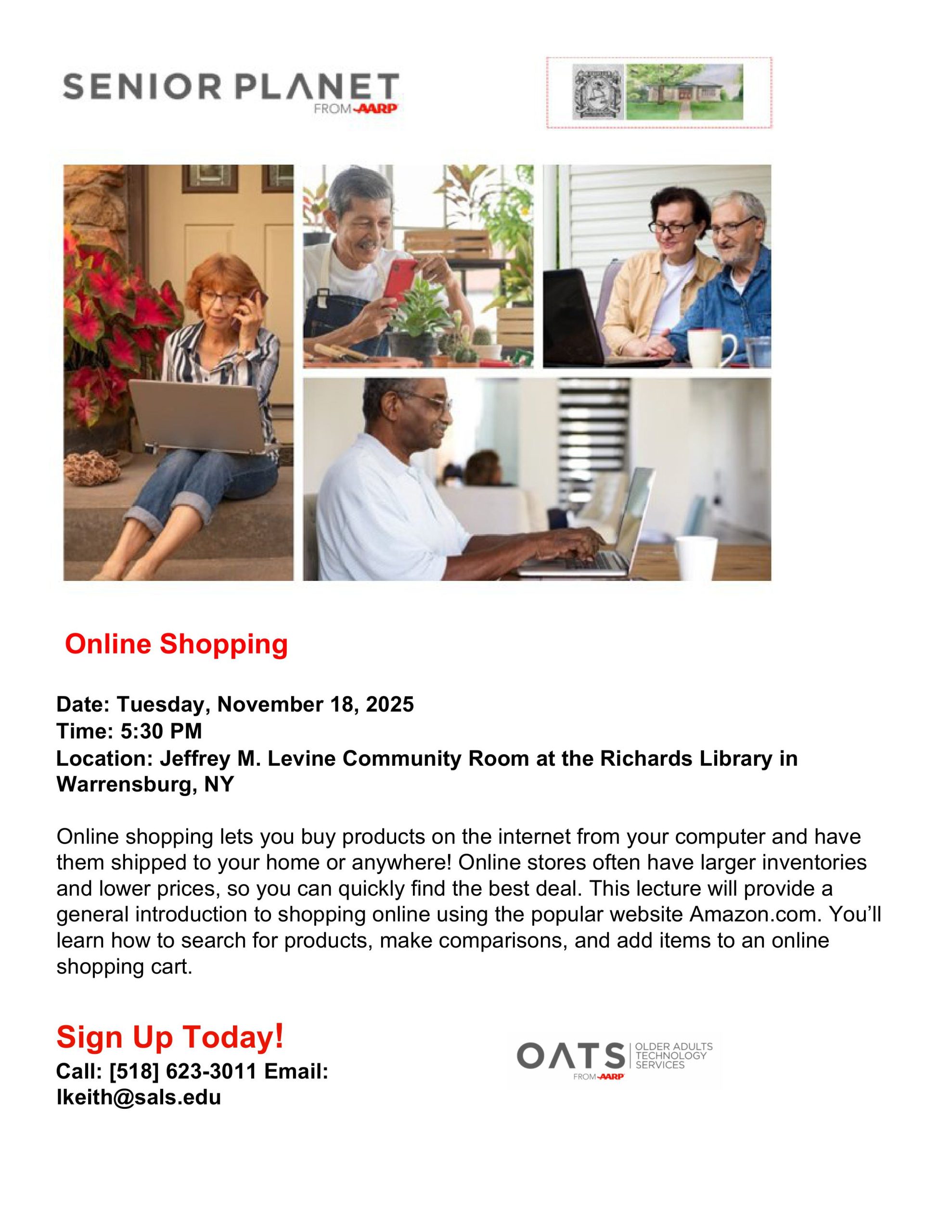 November 17, 2025(6 events) – Registration required: Wilton Wildlife Preserve & Park Come enjoy nature with others looking to get outside. This walk is geared towards gentle exercise and those with basic fitness levels. This program is suitable for ages 16 and up. – Registration required: Crandall Public Library This introduction to using a computer will cover basic vocabulary, using a mouse and keyboard, searching the internet, creating an email account, and creating and saving documents. The event is hosted by the Warren County One Stop Career Center and will be held at 333 Glen St., Suite 300, Glens Falls, NY 12801. Registration is required. – Registration required: Caldwell-Lake George Library Caldwell-Lake George Library is excited to continue our popular children's yoga storytime program, Once Upon a Time Yoga Adventures! Our "Little Yogis" ages 3-4 years old will meet on the following dates at 2:45 pm: