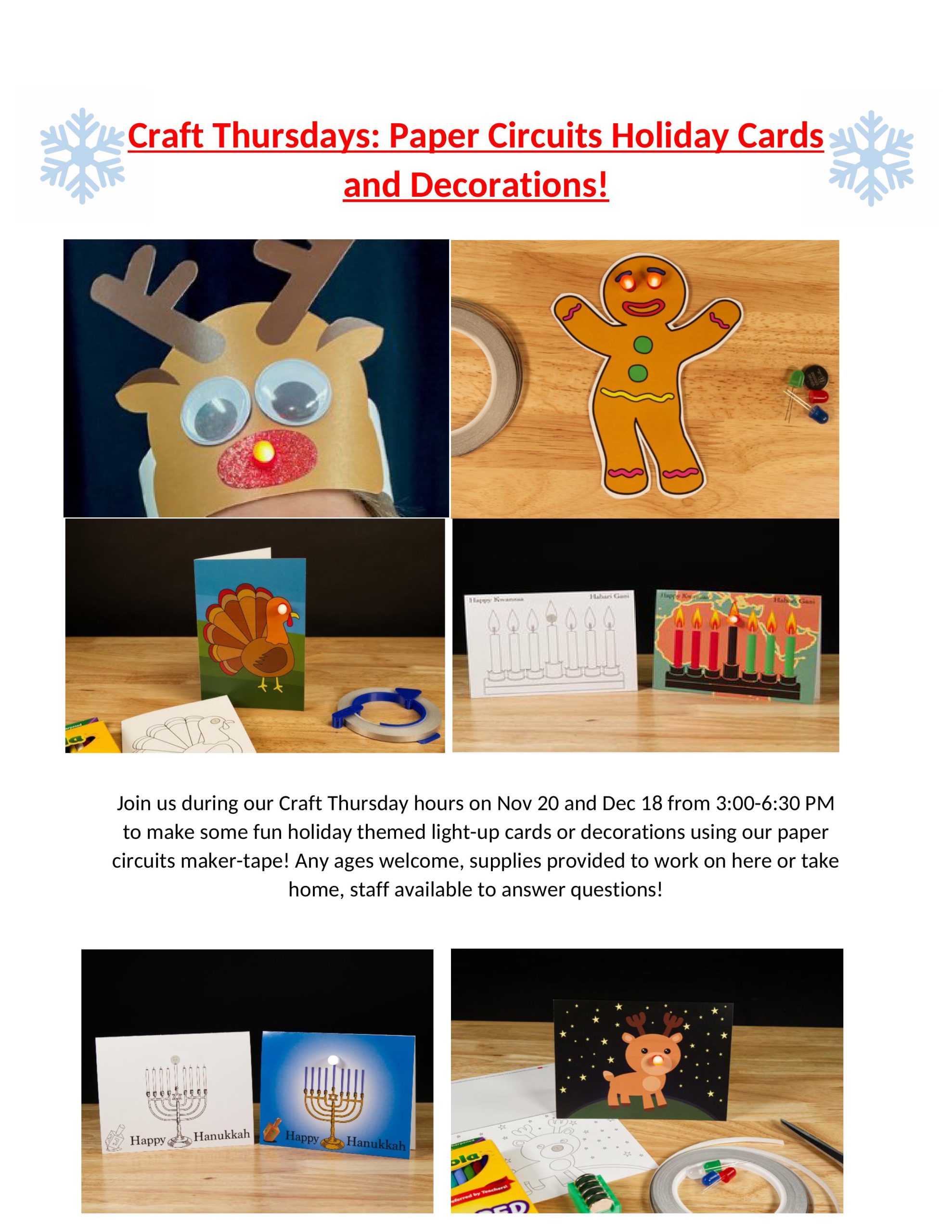 – Drop in to make one (or all!) of the ornaments and other winter themed crafts and help us recycle material left over from other programs! Enjoy light refreshments and mulled cider! Choose from: