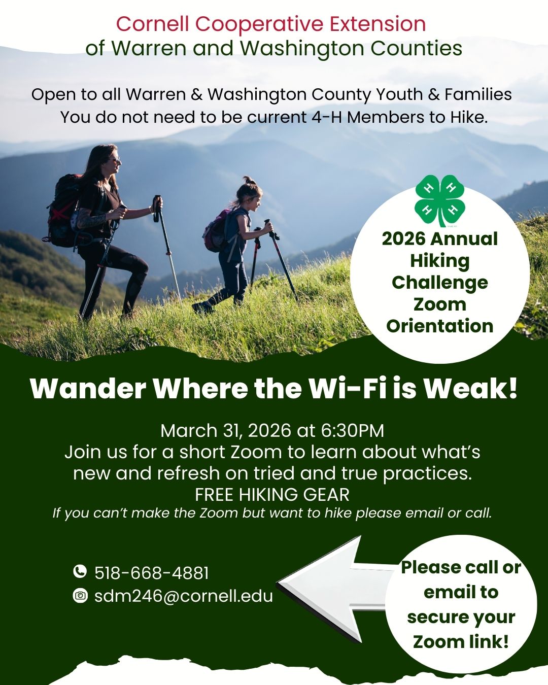 Registration for the 2026 4-H Hiking Challenge is open and the Zoom Orientation is scheduled for Tuesday, March 31st at 6:30pm.