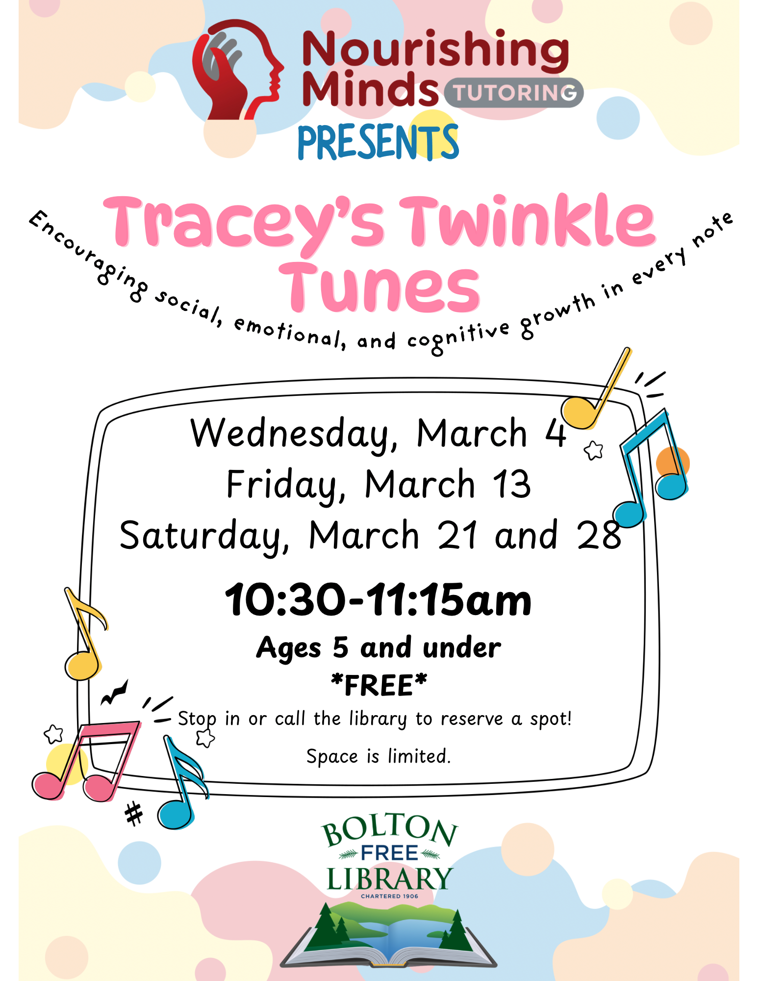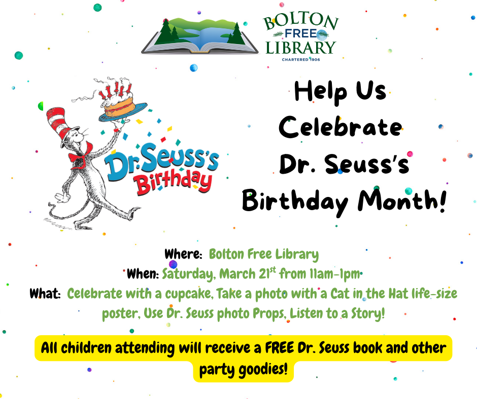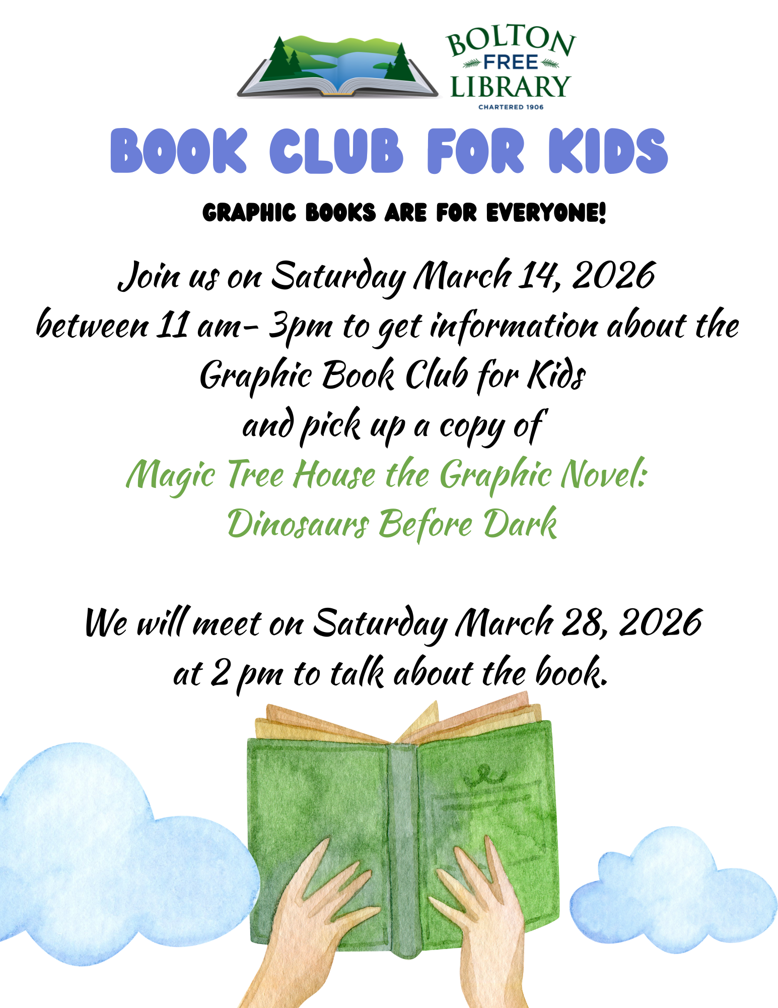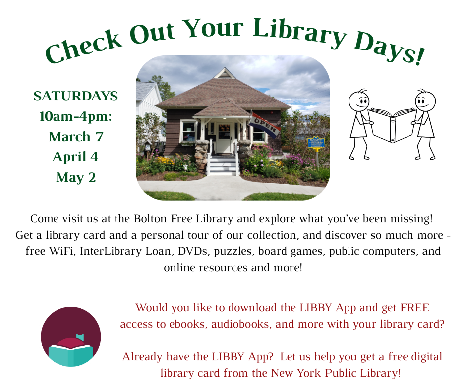 We have a new calendar! We’re experimenting with including free cultural and educational events at other local and regional libraries, museums, and non-profits. We hope a compilation of these great events will be a valuable resource for our community. Click on the categories above the calendar to limit the results by drive time from the Bolton Free Library. Be sure to check the hosting organization’s website for schedule changes and cancellations. Note that some of the events at and within 10 minutes of our library are not free; these are denoted with a “($)” and costs are included in those descriptions.
