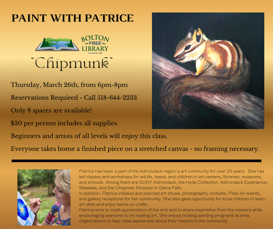 March 9, 2026(6 events) – Registration required: NY State DEC Join Eastern Adirondacks ReLeaf for a tree pruning workshop featuring Josh Del Rio, NYS DEC urban forester, and Jeff Speich, retired DEC forester, certified arborist, and NYS Urban Forestry Council board member. This workshop is free, but space is very limited! Registration closes on March 2, or when full. – Registration required: Wilton Wildlife Preserve & Park Come enjoy nature with others looking to get outside. This walk is geared towards gentle exercise and those with basic fitness levels. This program is suitable for ages 16 and up. ![]() – This group meets the second and fourth Mondays of the month from 12:30 to 2:30 pm in the community room. Writers of all styles and genres are welcome. – Registration required: Crandall Public Library at the Warren County Career Center This introduction to using a computer will cover basic vocabulary, using a mouse and keyboard, searching the internet, creating an email account, and creating and saving documents. The event is hosted by the Warren County One Stop Career Center and will be held at 333 Glen St., Suite 300, Glens Falls, NY 12801. – Kids in grades K-6 are invited to join us for our weekly free art program. Enjoy a different open-ended art project each week featuring a variety of art styles and materials. No sign up required. – Public Historian and Librarian, Tisha Dolton, discusses local and national commemorative quilt projects from the Centennial to the Bicentennial and into the present day with the hopes of inspiring new community quilt projects for the upcoming America250 celebrations. Part of our annual Women's History Month programming. This lecture also complements the current exhibition, curated by Tisha, How We Commemorate: Celebrations, Pageants, Exhibitions & More on display in the Folklife Hall Gallery and in the 2nd floor Literature Room through July 31, 2026. Major funding support to the Folklife Center at Crandall Public Library comes from the New York State Council on the Arts. |