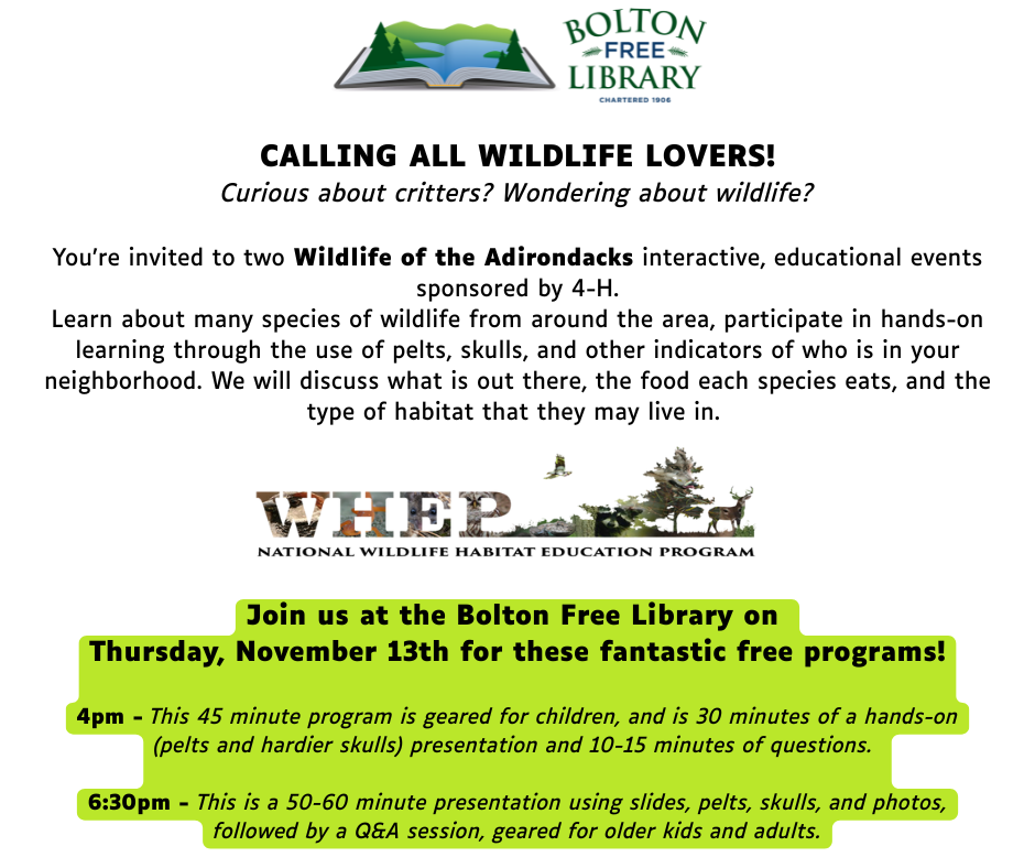 The Lake Placid Education Foundation Fund at Adirondack Community Foundation has awarded the Bolton Free Library a grant to purchase a high-resolution projector, to enhance the quality and enjoyment of our events and programs. We are so excited to receive this funding and be able to offer our presenters and patrons a high-quality visual experience.