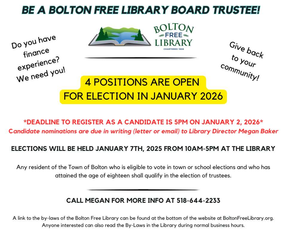 A list of Library events, recurring programs, and happenings at the Bolton Free Library. Please call 518-644-2233 with any questions.