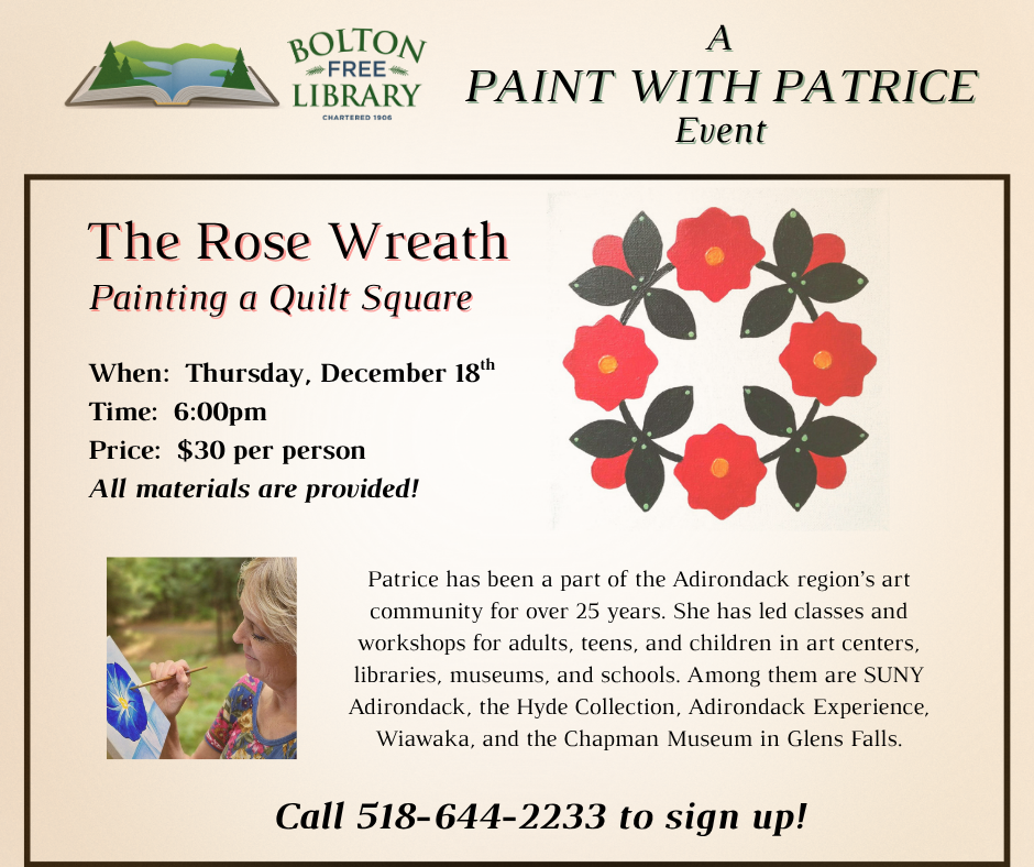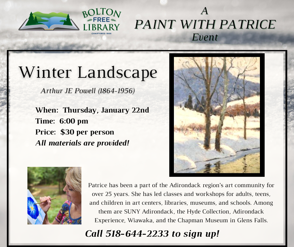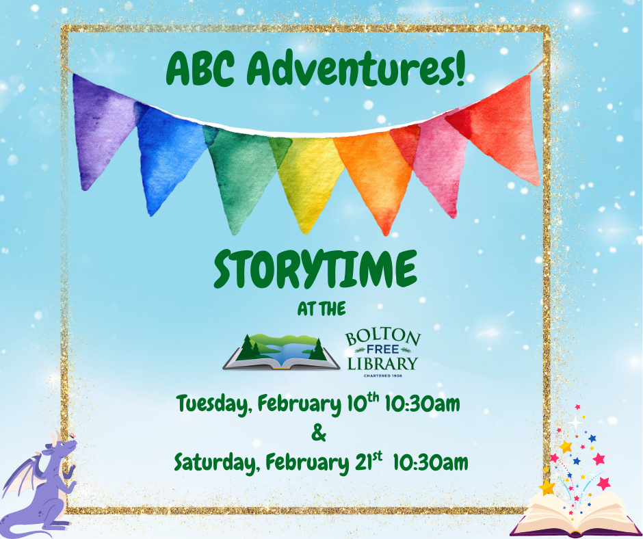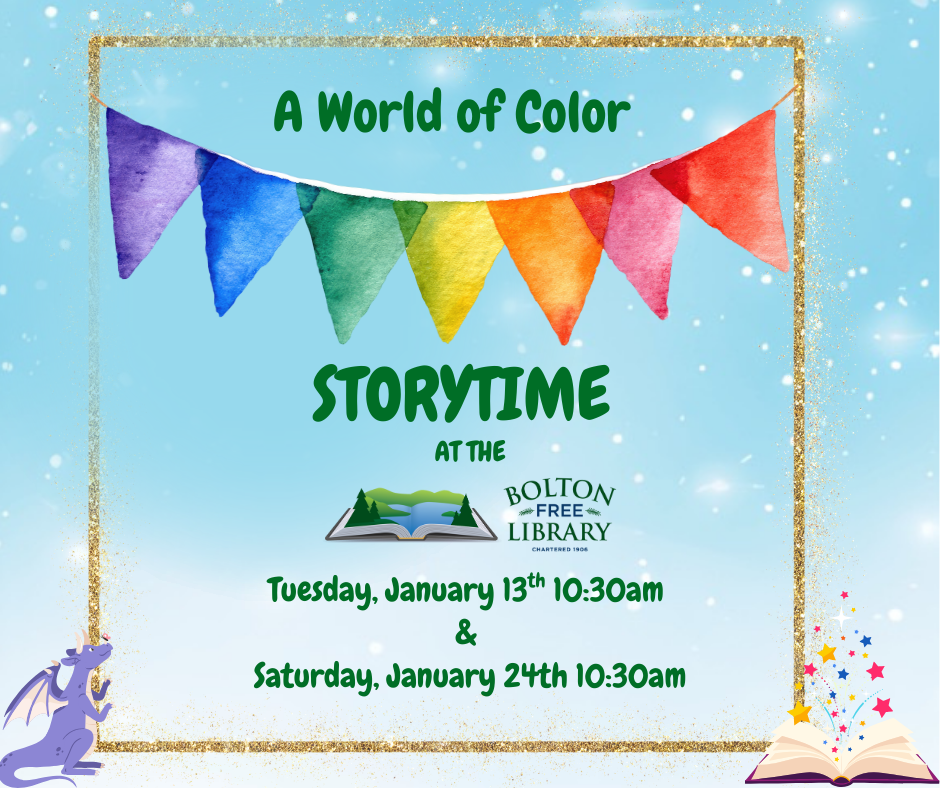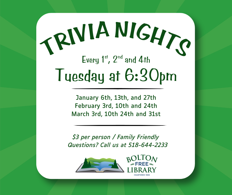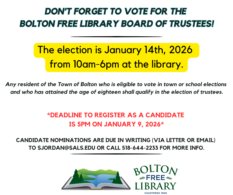 A list of Library events, recurring programs, and happenings at the Bolton Free Library. Please call 518-644-2233 with any questions.